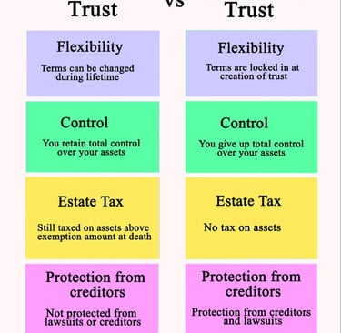 Protect your assets from creditors: An irrevocable trust can protect your assets from creditors because when you transfer the properties into the trust, you no longer legally own those properties. The irrevocable trust is a separate legal entity that holds the transferred assets, which are managed by a trustee.