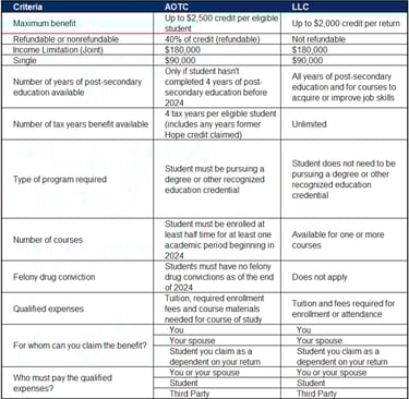 Tax year 2024 education benefits comparison